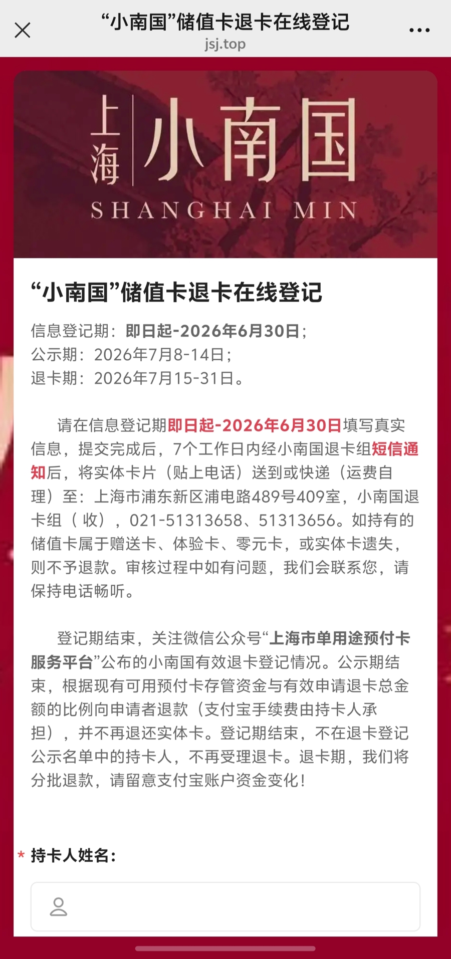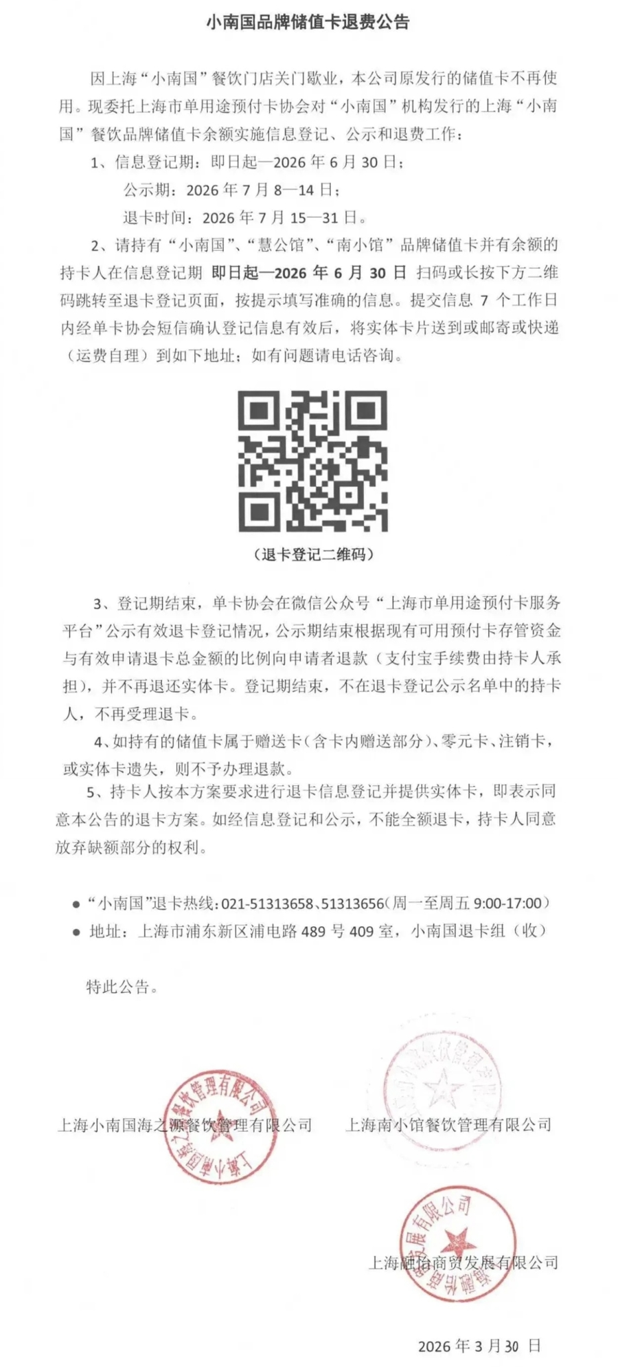 小南国品牌储值卡退费公告。