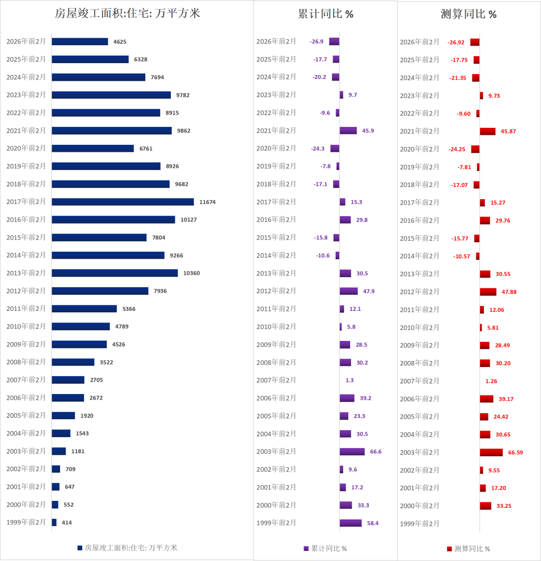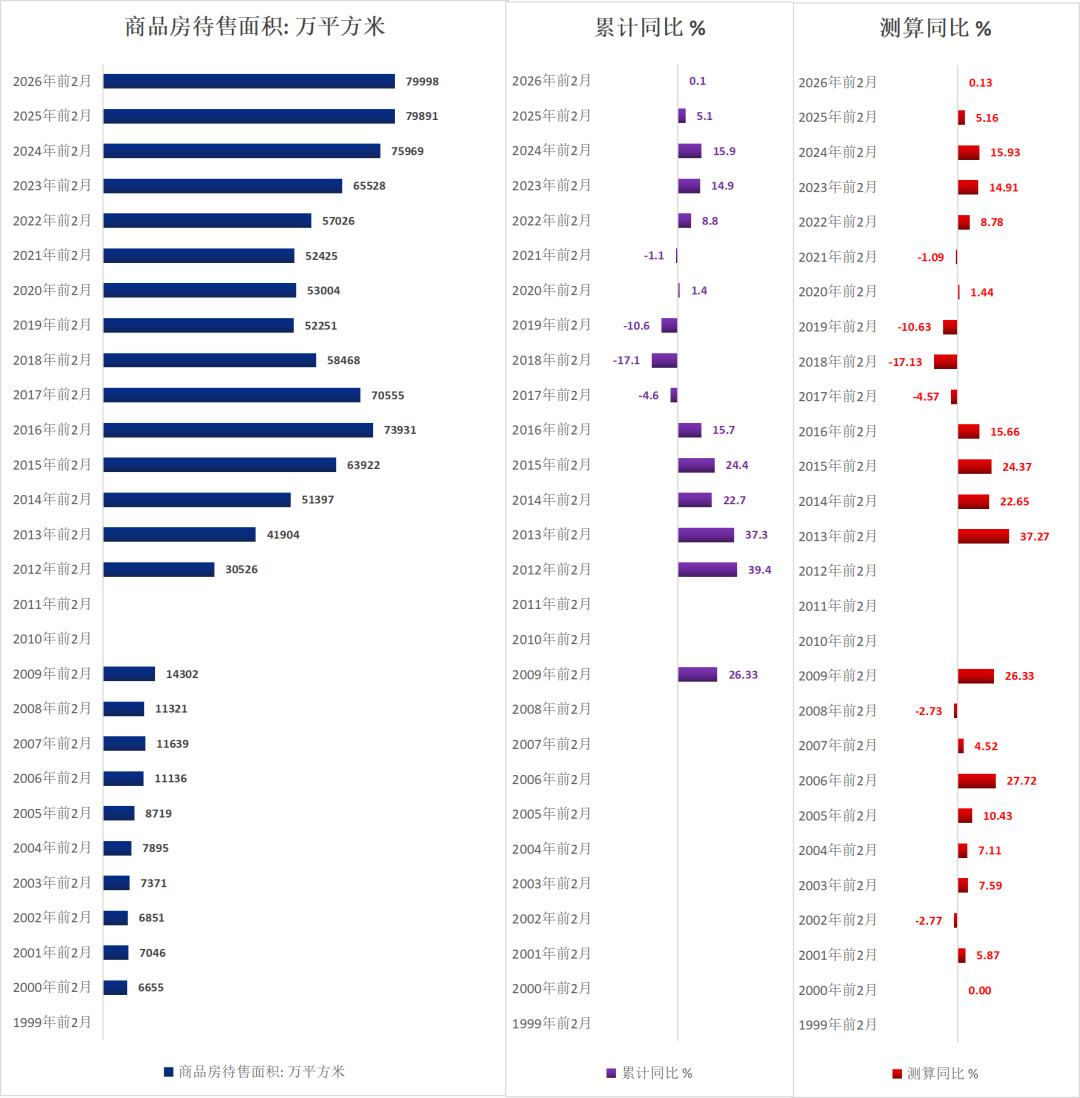 2026年2月底,商品房待售面积79998万闲居米,同比增0.1%。待售面积是积年前2月最高值。