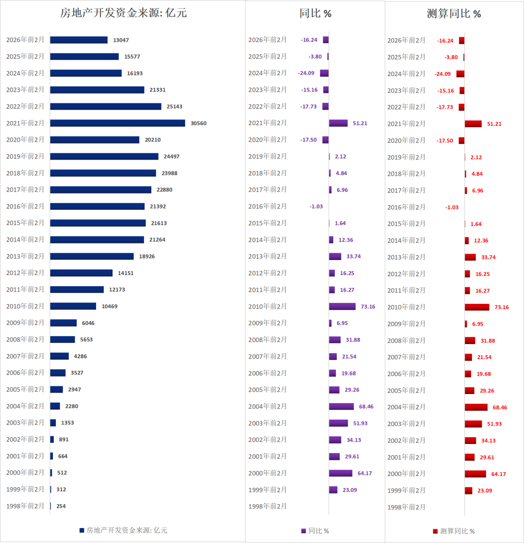 2026年前2月房地产缔造投资到位资金1.30万亿,同比下落16.24%。2011年以来同时最低值。