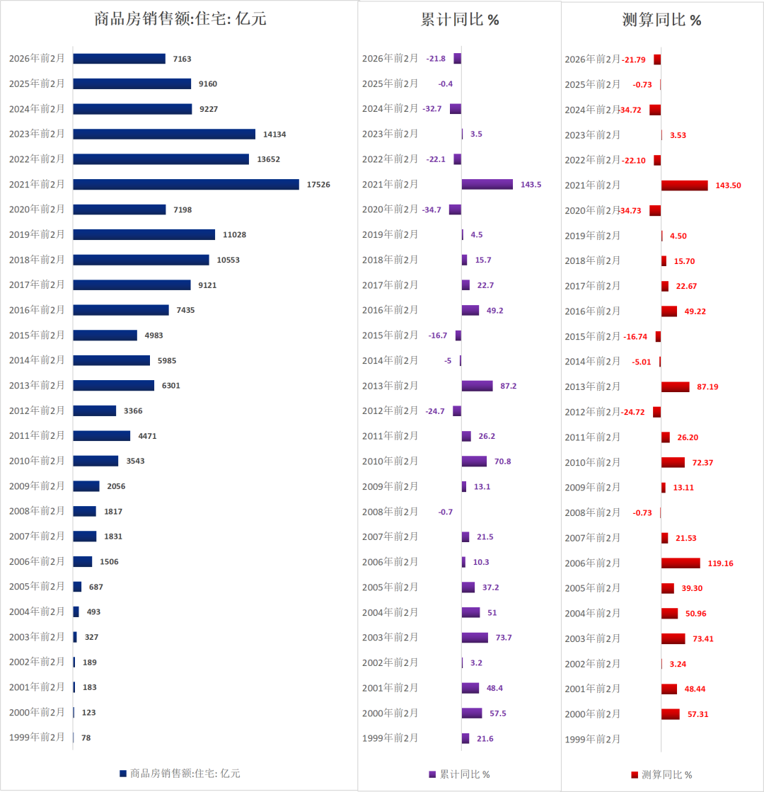2026年前2月,中国住宅累计销售额7163亿元,同比下落21.8%。完全值是2015年以来同时最低。