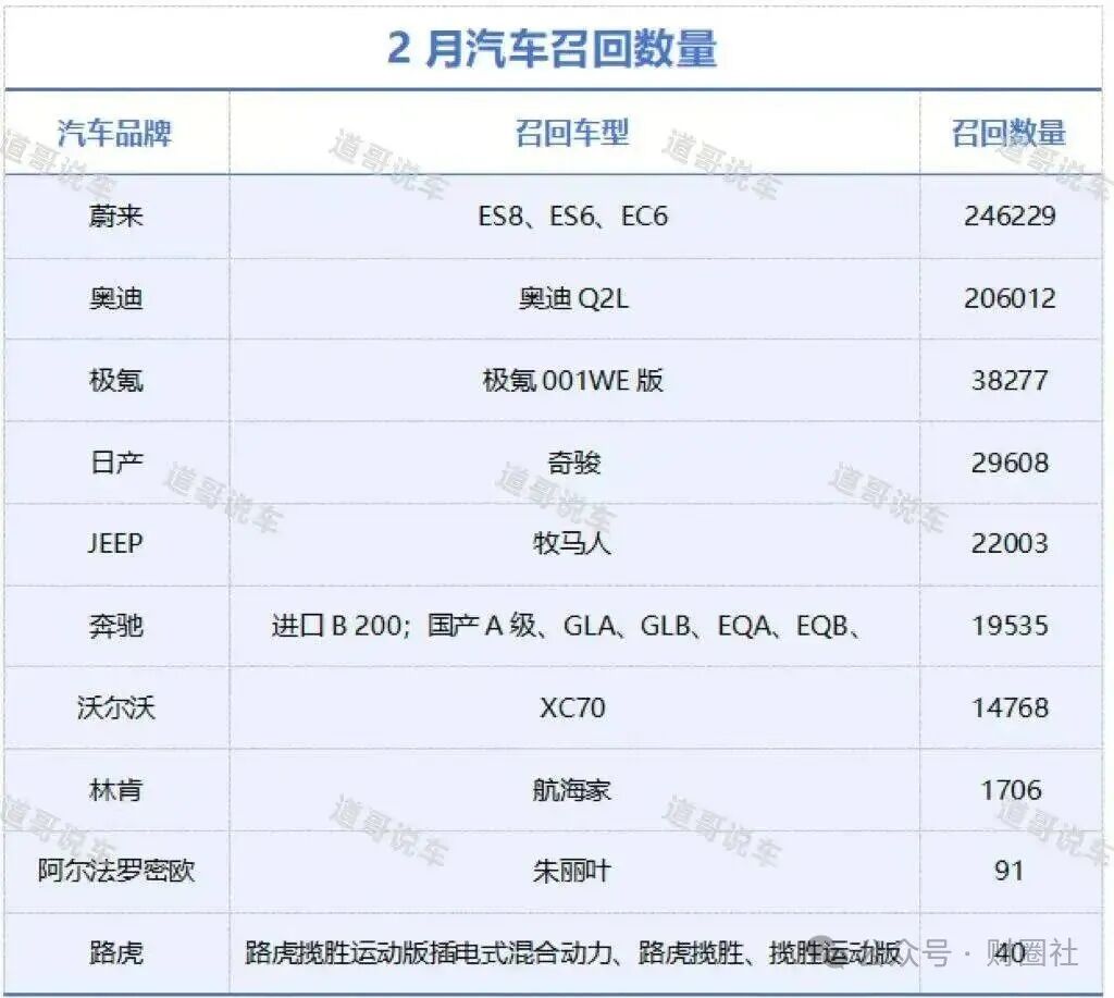 那么2026年怎么呢?据国度阛阓监督经管总局数据统计,本年2月共发布乘用车调回公告12则,波及调回乘用车总量共计578269辆,波及10个品牌。从数目来看,2026年2月汽车调回数目比拟客岁2月的几万辆要高不少,但远不如几年前那般巨大。