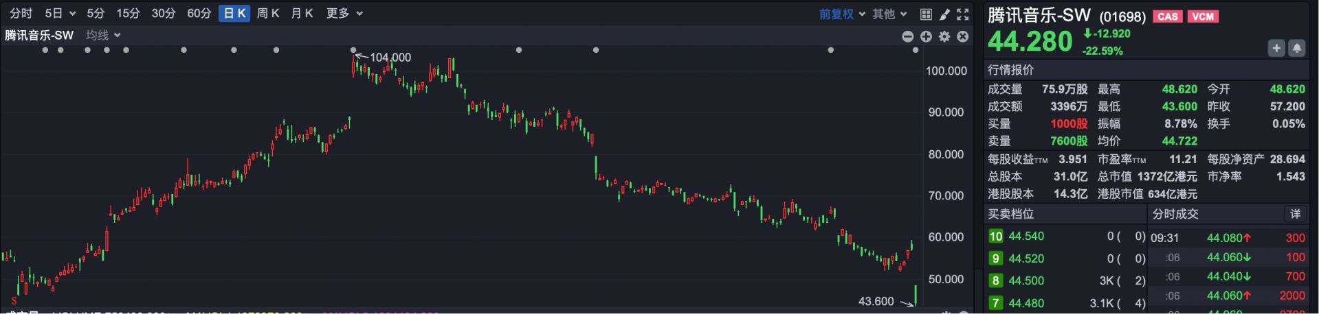 开盘之后,腾讯音乐港股跌幅马上扩大到23%隔邻。客岁8月13日,腾讯音乐港股一度创下104港元的历史新高,但7个月之后,其股价依然跌到最低43.6港元,阶段最大跌幅高达58%。