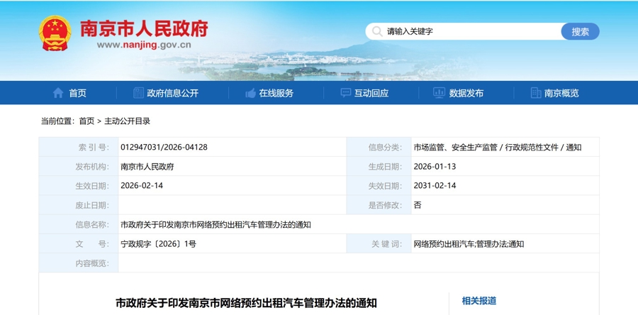 日前,南京市人民政府官网发布通知,公开发布《南京市网络预约出租汽车管理办法》。