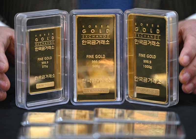 首尔的韩国黄金交易所,工作人员展示金条。新华社/法新