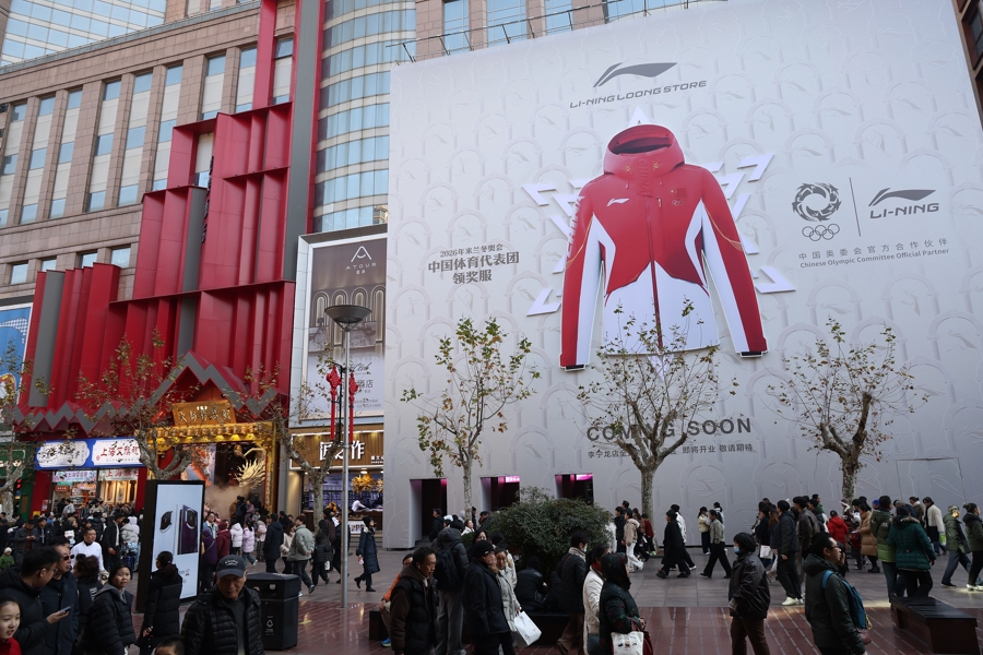 上海南京路步行街一大楼墙面上装饰着一件“超大码”2026年米兰冬奥会中国体育代表团领奖服,十分抢眼吸睛。