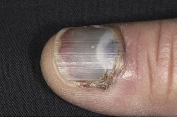 如果是一点点出血,我们叫作裂片状出血,如果是一团团地出血,则叫作甲下出血或者甲下血肿。