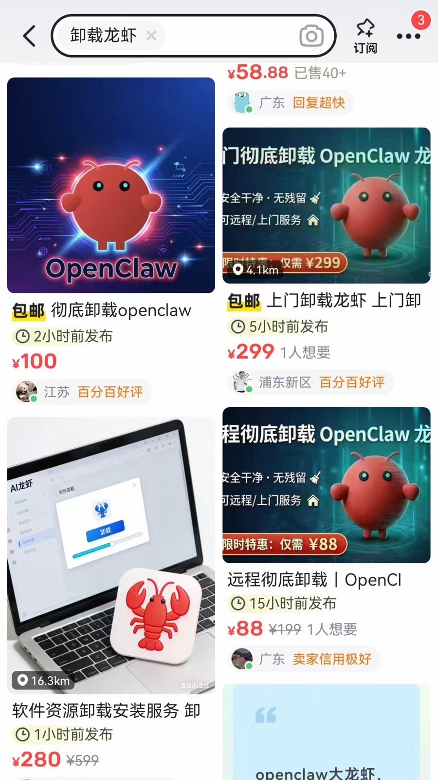 最近,市集上出现上门卸载OpenClaw管事,打出“安全干净、无残留”标语,价钱从四五十元到数百元不等,“龙虾卸载指南”也在收罗鼎哄传。