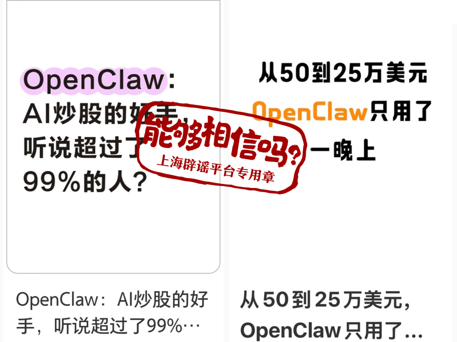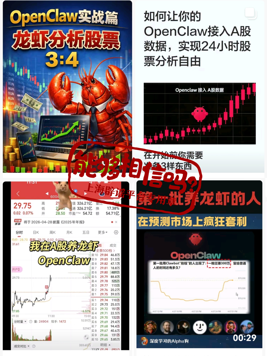 在OpenClaw的应用中,辅助投资很受暖和。酬酢平台上,许多帖子把OpenClaw四肢念“投资神器”,称“50好意思元炒到25万好意思元,OpenClaw只用了一晚上”“用AI炒股耕种了99%的东说念主”“用OpenClaw作念投资圣洁竣事钞票目田”……还显现出不少“OpenClaw炒股教程”。
