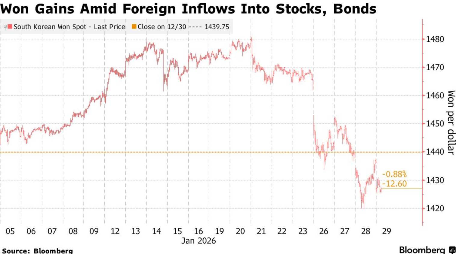 “韩国的基本面表明,韩元兑美元汇率将在 2026 年全年期间走强,”三菱日联银行(MUFG Bank Ltd.)高级外汇分析师迈克尔·万(Michael Wan)表示。他还称,日元一直是关键的推动因素,并补充称这引发了有关韩元是否也会面临干预的疑问,无论是单方面干预还是与美国当局协调干预。万预计,到 2026 年底,韩元兑美元汇率将升值至 1 美元兑 1385 韩元。