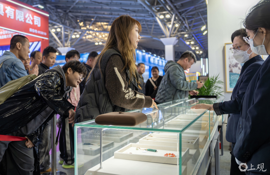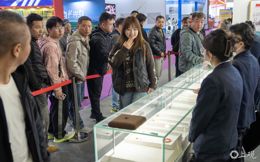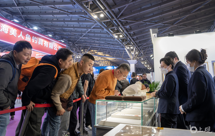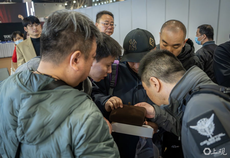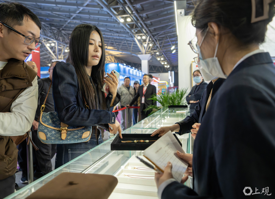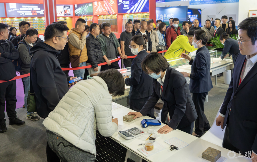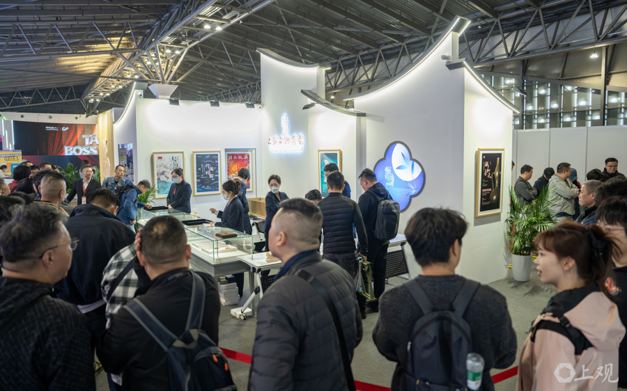 据先容,位于广东路的上海文物商店因装修暂时停业,这次参展旅博会引诱了好多保藏醉心者。为了让更多不雅众感受到文物保藏的乐趣,每位不雅众每次列队仅限购买一件物品,如有多件中意藏品,需重新列队。