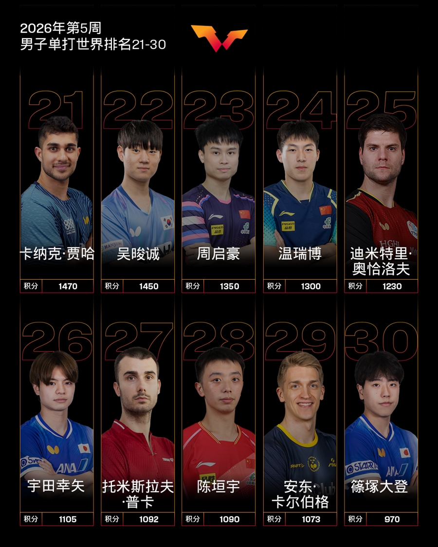 2026赛季开启至今,温瑞博表现亮眼。多哈球星赛从资格赛突围,爆冷击败世界第三雨果‧卡尔德拉诺后获亚军;马斯喀特站再进一步,夺得职业生涯首个成人国际赛事冠军。其世界排名从月初的第53位跃升至第24位,成为国际乒坛上升势头最猛的新星。